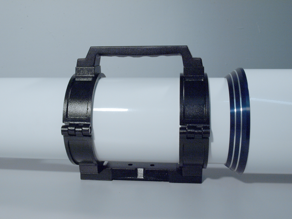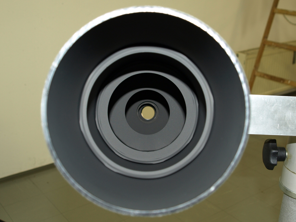 The telescope tube is aluminium and blackened on the inside to avoid scattered light. The dew shield is removable.