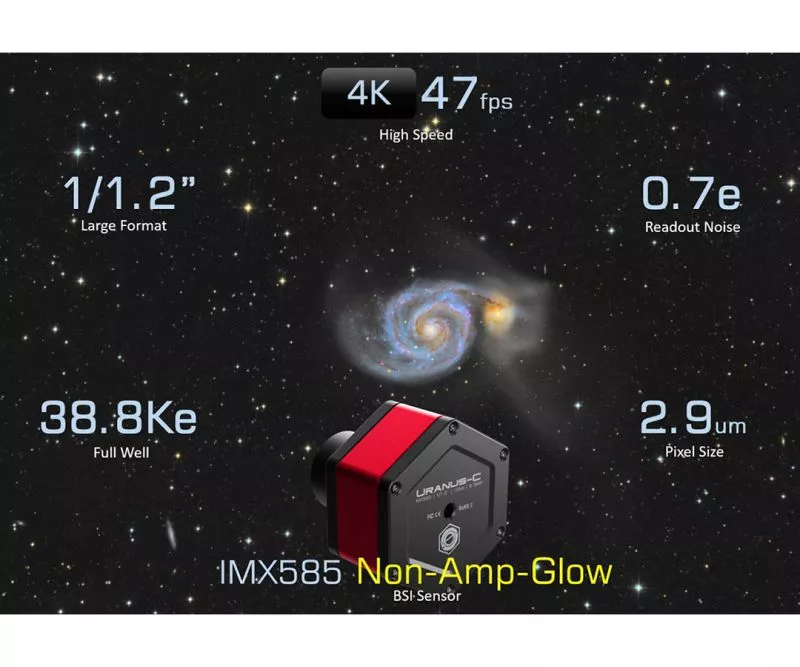 Die TS-Optics TS585C Kamera ist mit einem 1/1,2"-Sensor ausgestattet. Dieser moderne Sony IMX585 Sensor überzeugt vor allem durch die hohe Auflösung (2,9-µm-Pixel) und durch das völlige Fehlen des störenden Verstärkerglühens (Amp-Glow). Dadurch wird diese Kamera für Langzeitbelichtung (Deep-Sky-Fotografie) sehr interessant. Der Sensor ist groß genug für viele Deep-Sky-Objekte, trotzdem kommt man meist ohne Korrektor aus. Die Kamera ist sehr gut geeignet für: