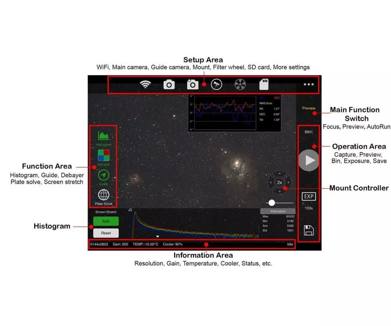 ♦ Die komplette Bedienung Ihrer Kamera, des Autoguiders und die automatische Nachführung Ihrer Montierung vom Smartphone oder Tablet aus