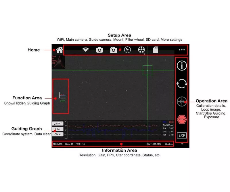 ♦ Die komplette Bedienung Ihrer Kamera, des Autoguiders und die automatische Nachführung Ihrer Montierung vom Smartphone oder Tablet aus