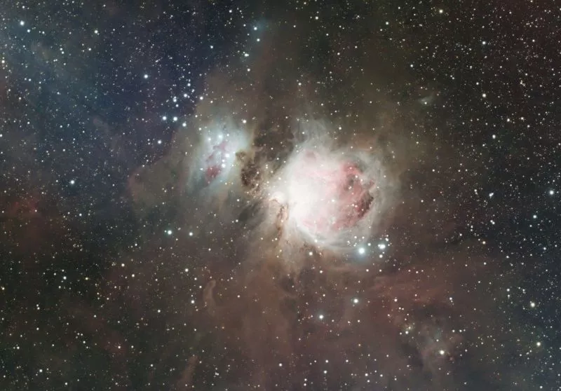 Am Montag 20.02.23 hatte ich nach diversen Problemen nur noch 117 Minuten Zeit um auf M42 zu belichten. Leider musste ich viele Bilder wegwerfen, da sich die Bäume in unserem Garten allmählich immer mehr vor den Himmelsbereich bewegten. Dies ist mir allerdings wärend der Aufnahme nicht aufgefallen, da ich nebenbei meine Werkstatt aufgeräumt habe. Für den Stack konnte ich dann noch 84 Minuten verwenden. Der Stack wurde ohne Darks erstellt, da ich diese nicht zur Verfügung hatte. Ich habe die Daten bei einem Bekannten bearbeitet, da er den BlurXterminator von RC Astro hat. Diesen wollte ich gerne mal testen. Ich habe aber vergessen mein Masterdark mitzunehmen. Insofern ist sicher noch Optimierungspotential. Das Bild wurde stark zugeschnitten (ca. 40% fehlen) da es einen heftigen Gradient hatte (Werbeschild vom Nachbarn).