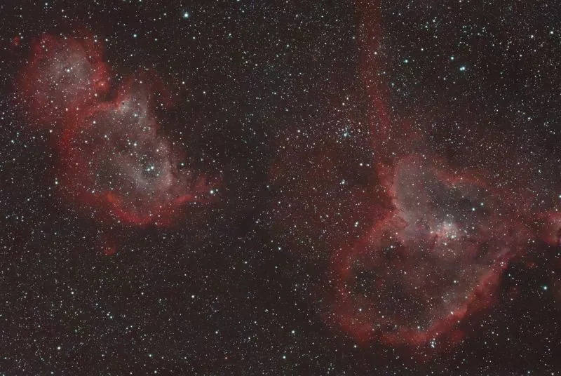 Bei IC1805/1848 hatte ich trotz schlechter gemeldeten Bedingungen die Möglichkeit 5 Stunden im Schmalband (Optolong L-Extreme) zu belichten. Davon konnte ich 93 Aufnahmen für den Stack verwenden. Leider machte der Nebel ab ca. 22 Uhr das Signal/Rauschen etwas schlechter. Dennoch sind auch Details auf den letzen Aufnahmen nach 2:00 Uhr sichtbar. Die Aufnahmen habe ich nicht gedrizzelt, das werde ich das nächste Mal wieder tun. Außerdem werde ich den Tip von Christian Vulpescu befolgen und bei Schmalband den Gain mal erhöhen. (habe einen sehr niedrigen Offset von 100 und Gain von 139 genutzt). Das Bild wurde in der Bearbeitung nur marginal gecropped. Alles in allem ein schöner Einstieg mit dem neuen Teleskop, auch wenn es Wahrscheinlich erst mal nicht so viel zum Einsatz kommen wird. In den nächsten Wochen wird Brennweite wohl Trumpf sein.