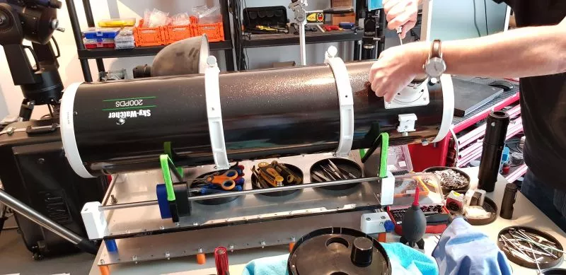 Wir haben nun unsere optische Werkbank komplettiert um einfacher und schneller Teleskope zu justieren und reparieren zu können. Die neue Teleskophalterung kann nun Teleskope bis ca. 50kg tragen und dient als Plattform um an den jeweiligen Teleskopen die wir an den Sternfreund übergeben, die bei uns gekauft wurden oder repariert / optimiert / überprüft werden sollen, perfekt arbeiten zu können. Der eine Haltearm lässt sich individuell verschieben um jede gängige Tubuslänge abzudecken. Die bisherige Montierung an unserer optischen Bank verrichtet weiterhin ihre treuen Dienste für kleinere Teleskope. Die alte Halterung für größere Teleskope wird an einem anderen Arbeitsplatz weiter verwendet.