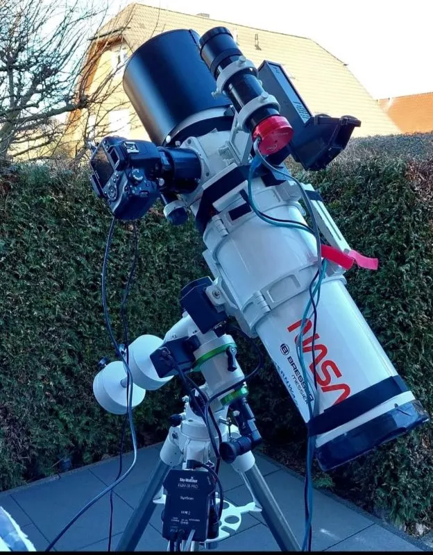 Beraten wurde ich hier auch von meinen mittlerweile Kollegen der Sternwarte Paderborn, wo ich kurzerhand in den Verein eintrat. Raus kam ein Bresser Newton 150/750 mit Exos 1 Montierung ohne Nachführung und GoTo, der mir als guter Allrounder mehrfach nahegelegt wurde. Damals war ich mir der Situation aber nicht so bewusst, das ich vielleicht mal fotografieren möchte. Nach und nach kamen Begriffe wie Langzeitbelichtung, Autoguiding etc. dazu. Zudem hatte ich echte Probleme, trotz diverser Hilfestellungen wie Apps und Sternenatlas ein Objekt, zu finden. Im Juni 2019 bin ich dann schließlich auf eine GoTo Montierung von Skywatcher umgestiegen, hierbei handelt es sich um die EQM 35 GoTo Pro Syncscan.