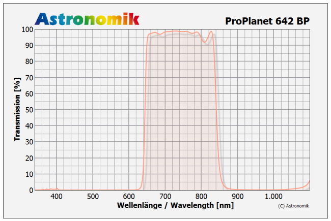 Der Astronomik ProPlanet 642BP ist ein Bandpassfilter, der fast nur Infrarot passieren läßt. Mit dem Filter kann man KEINE echten RGB