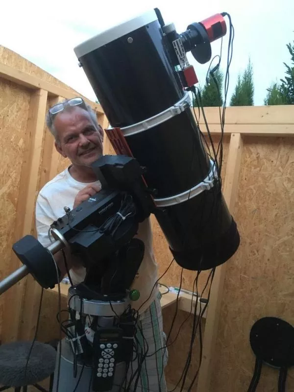 Gesagt, geplant, getan! Die Bilder wurden besser, das Risiko eines Ergebnisses aber auch größer, denn die Objekte wurden mit der Zeit anspruchsvoller und die Belichtungszeiten länger, somit auch die Bildbearbeitung komplizierter, aber auch aufwändiger. Auch hier holte ich mir für meine Lernkurve Unterstützung und Ratschläge. Es folgten, was das Equipment anging eine modifizierte DSLR, dann eine gekühlte Astrokamera….die 2. und 3. hinterher. Der GSO war nicht mehr genug und es gab einen 10“ f4 Newton. Dazu einen 150er MAK mit 1800mm Brennweite und einen Esprit 80ED, nebst Barlows, Guiding-Rohr etc etc etc. Irgendwann hat man so seinen Liebling gefunden. Bei mir ist das der 10“ f4 Newton, den ich dann „tunte“. Anderer OAZ, Veloursauskleidung, FS-Heizung etc. Vor 2,5 Jahren dann habe ich mir dann um die Säule eine Rolldachhütte bauen lassen, was ich zu keinem Zeitpunkt, trotz der Kosten bereut habe.
