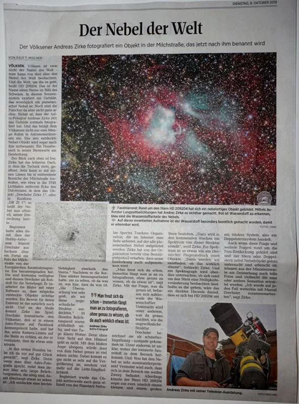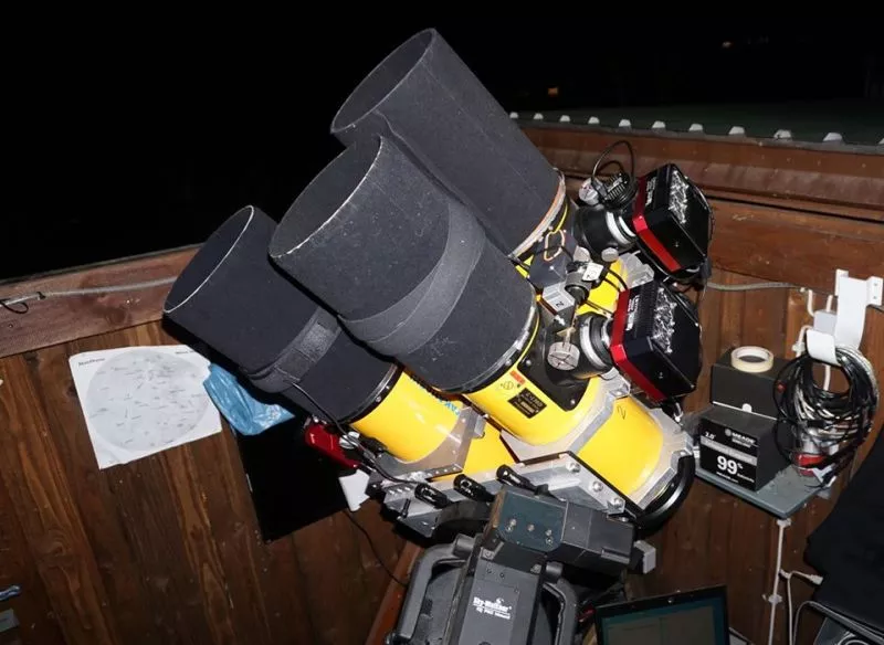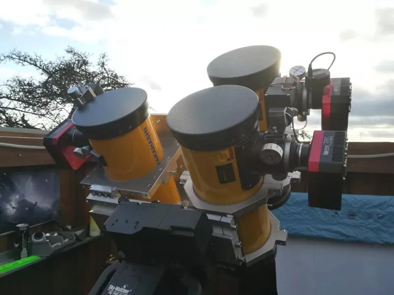 Das Tripple Teleskop besteht aus 3 Takahashi Epsilon 130 Astrographen.Die Halterung wurde aus Aluminium gefräst, selber entworfen und gebaut von Andreas Zirke. 3 Atik One 9.0 mono Kameras vervollständigen den Eigenbau. Gesteuert wird alles über 3 Laptops (1 Laptop pro Teleskop und Kamera).