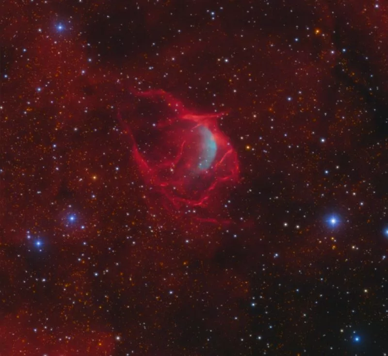 Ein erster Halbmond OIII scheint im Herzen blutroter Filamente zu schweben, die vom Stern am Ende des Lebens vertrieben wurden.