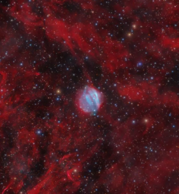 Typisch für planetarische Nebel ist eine kompakte Hülle aus H-alpha und OIII, die einen kleinen Weißen Zwerg umgibt.