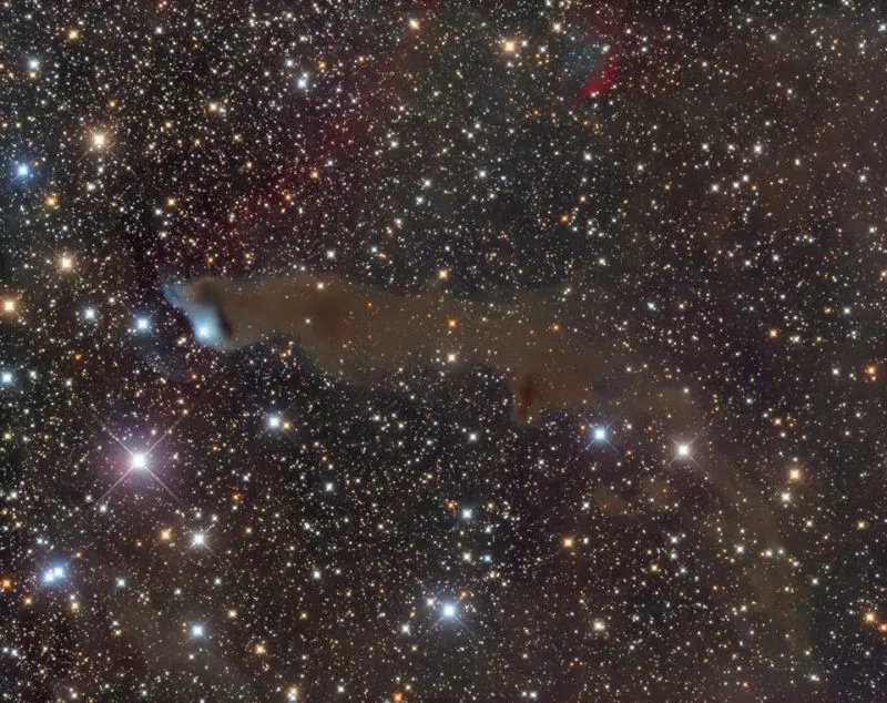 Beschreibung: Sie wird beschrieben als ein "staubiger Vorhang" oder eine "geisterhafte Erscheinung". Dieser mysteriöse Reflexionsnebel "vdB 152" ist eigentlich sehr schwach. Er liegt etwa 1400 Lichtjahre entlang der nördlichen Milchstraße entfernt in dem königlichen Sternbild Kepheus. Nahe dem Rand einer großen molekularen Wolke blockieren Taschen aus kosmischem Staub das Licht von Sternen im Hintergrund oder zerstreuen das Licht von dem eingebetteten hellen Stern (oben). Dadurch erhalten Teile des Nebels eine charakteristische blaue Farbe. Man nimmt auch an, dass das ultraviolette Licht des Sternes eine schwache rötliche Lumineszenz im Nebelstaub erzeugt. Obwohl Sterne molekulare Wolken entstehen, scheint dieser Stern nur zufällig in diesen Bereich gewandert zu sein. Die gemessene Geschwindigkeit durch den interstellaren Raum ist nämlich sehr unterschiedlich gegenüber der Geschwindigkeit der Wolke. Dieses weitreichende teleskopische Bild fasst etwa 7 Lichtjahre in der geschätzten Distanz von vdB 152.