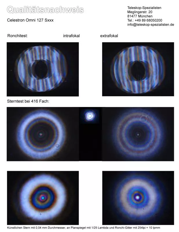 Ein Qualitätsnachweis mit Sterntest und Ronchi für einen Celestron OMNI Schmidt Cassegrain 127/1250mm.