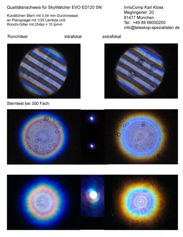 Ein Testbericht mit Sterntest und Ronchi für einen SkyWatcher Evostar-120ED 120mm 900mm ED-APO Teleskop mit viel Zubehör