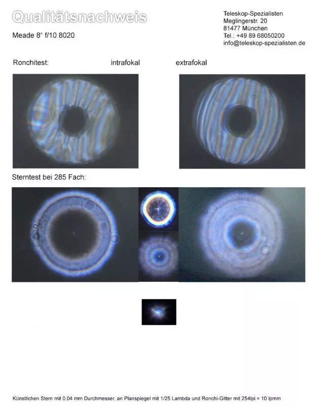 Qualitätsnachweis (Sterntest und Ronchi-Aufnahme) eines Meade 8020 8" Schmidt-Cassegrain. Dieser wurde so gut wie es ging von uns optimiert und justiert.