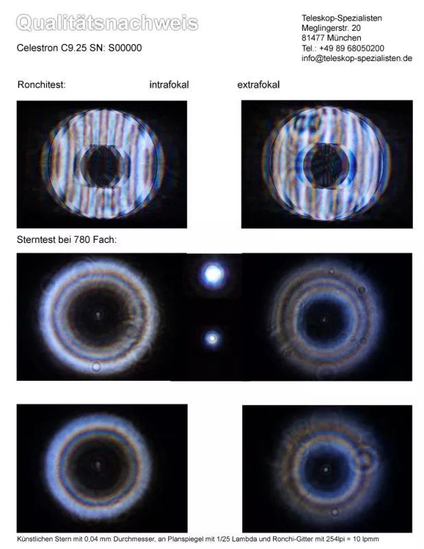 Ein Qualitätsnachweis mit Sterntest und Ronchi für ein Celestron C9.25 Schmidt Cassegrain.