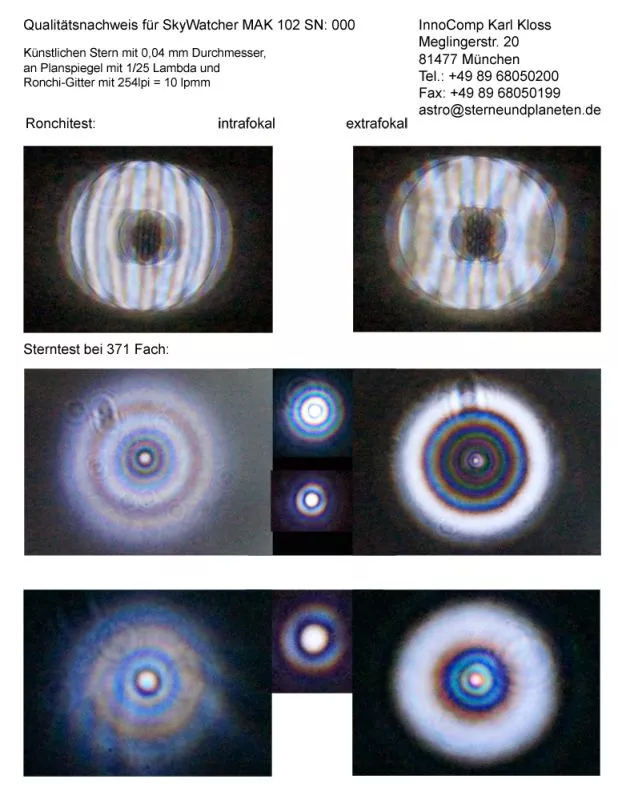 Ein Qualitätsnachweis mit Sterntest und Ronchi für einen SkyWatcher Maksutov 102/1300mm.