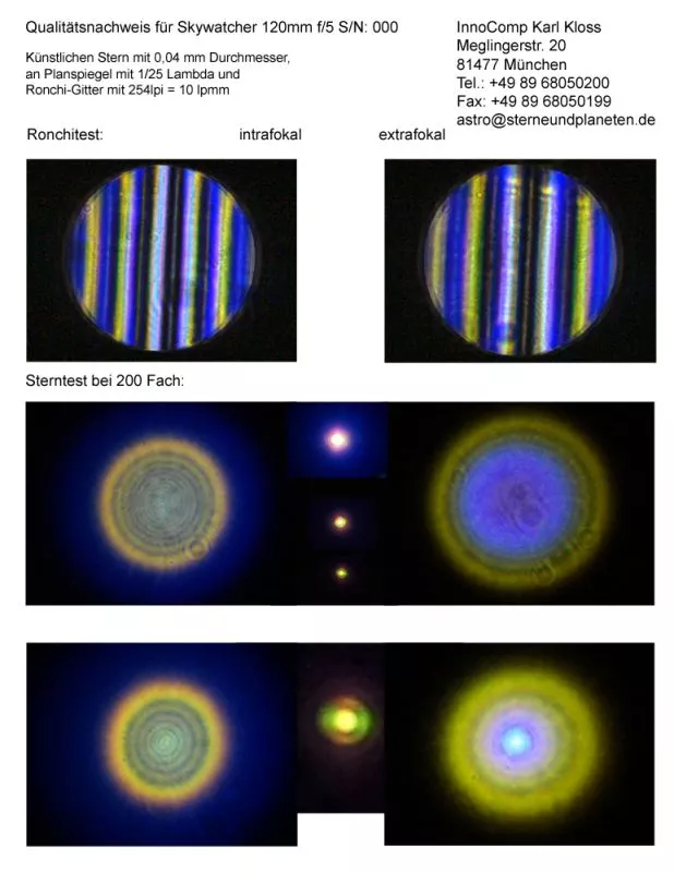 Ein Qualitätsnachweis mit Sterntest und Ronchi für einen Skywatcher Black Diamond Line Großfeld Refraktor 120/600mm.