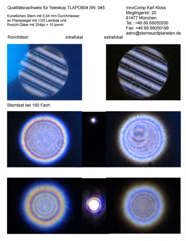 Der Sterntest wurde mit einem 3mm Nagler Okular mit einer Vergrößerung von 160-Fach aufgenommen, und das Ronchi mit 10lpmm.