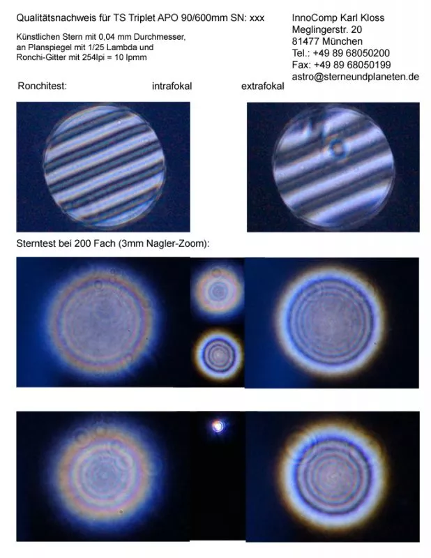 Ein Qualitätsnachweis mit Sterntest und Ronchi für einen TS Triplet APO 90/600mm FPL53 Carbon Tubus 2,5" PHOTO-Auszug.