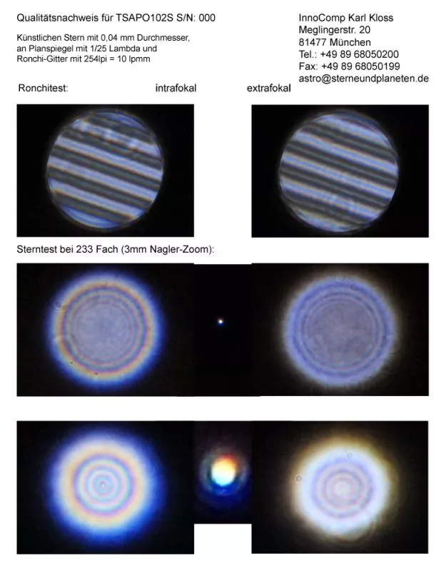 Ein Qualitätsnachweis mit Sterntest und Ronchi für einen TSApo102S TS PHOTOLINE 102/700mm FPL53 Triplet APO - 3" Crayford.