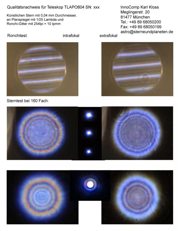 Der Sterntest wurde mit einem 3mm Nagler Okular mit einer Vergrößerung von 160-Fach aufgenommen, und das Ronchi mit 10lpmm.