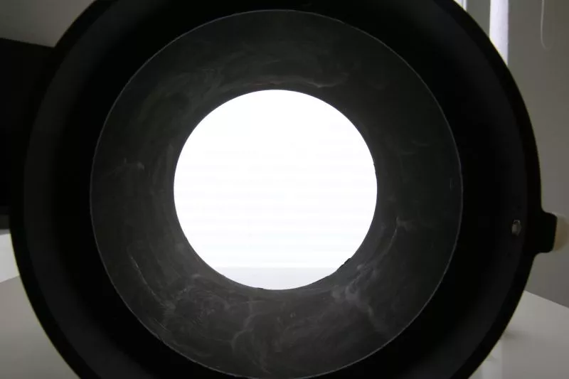 Regarding the internal blackening of the tube, I'd say: If you're going to the (very commendable!) effort of applying such an elaborate coating with expensive anti-reflective paint, then these blackened surfaces should be better protected afterward. I don't know who or what rubbed or scratched the paint on my dew cap, but I'll probably have to grab a spray can and touch it up a bit. In any case, the positive effect of the anti-reflective paint is partially gone. (see photo attached)
