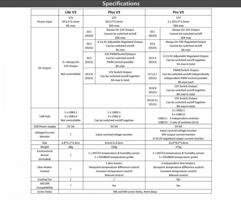Die Wanderer Box Lite V3 ist mit 5 12-V-DC-Ausgängen, 3 USB-2.0-Anschlüssen und 1 USB-3.1-Gen-1-Ausgang ausgestattet; dank dieses Systems können Sie zahlreiche Kabel an Ihrem Teleskop vermeiden und haben ein wesentlich aufgeräumteres System.