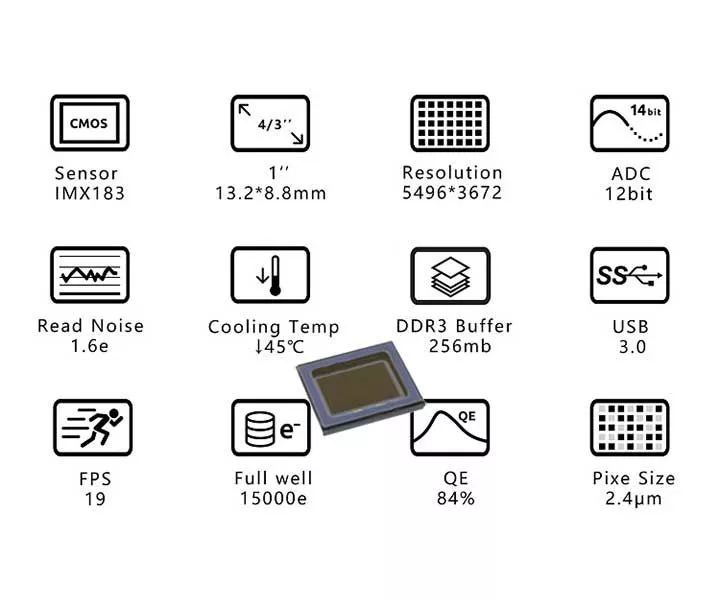 ♦ Sensor SONY Exmor R BSI IMX183 Sensor mit 13,2 x 8,8 mm Größe, Diagonale 15,9 mm - Color