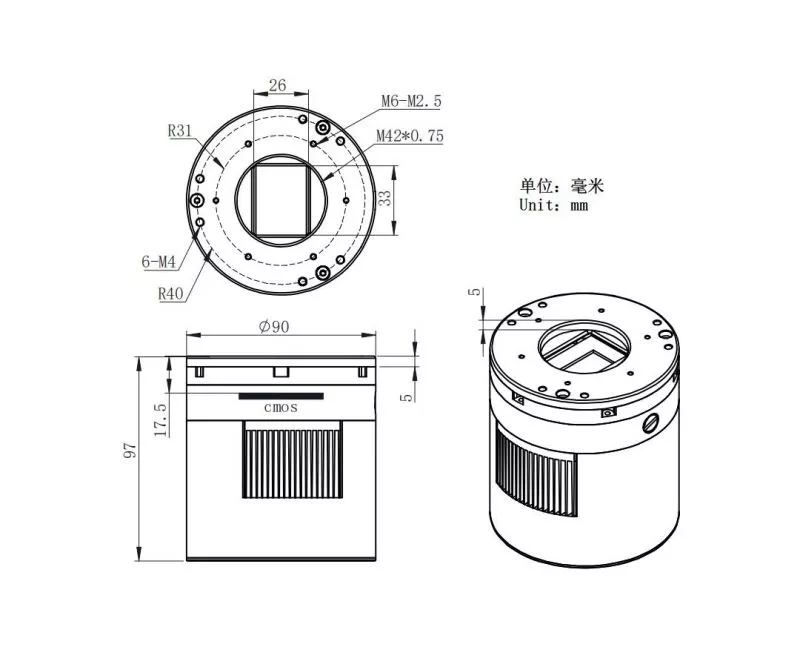 ♦ Abstand T2-Anschlussgewinde (Innengewinde) zum Kamerasensor: 17,5 mm