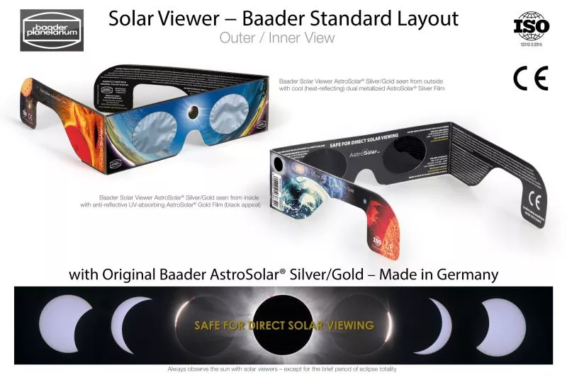 Wir stellen Sonnensichtbrillen mit AstroSolar® Silver Folie seit über 25 Jahren her. Während der Sonnenfinsternis im Jahre 1999 waren mehr als 20 Millionen Sonnenfinsternisbrillen mit AstroSolar®-Silver Folie im Einsatz. Für die Sonnenfinsternis in den USA 2017 bringen wir nun die Weiterentwicklung auf den Markt: Solar Viewer AstroSolar® Silver/Gold, mit augenseitig reflexfreiem Einblick für ein hervorragendes Seherlebnis.