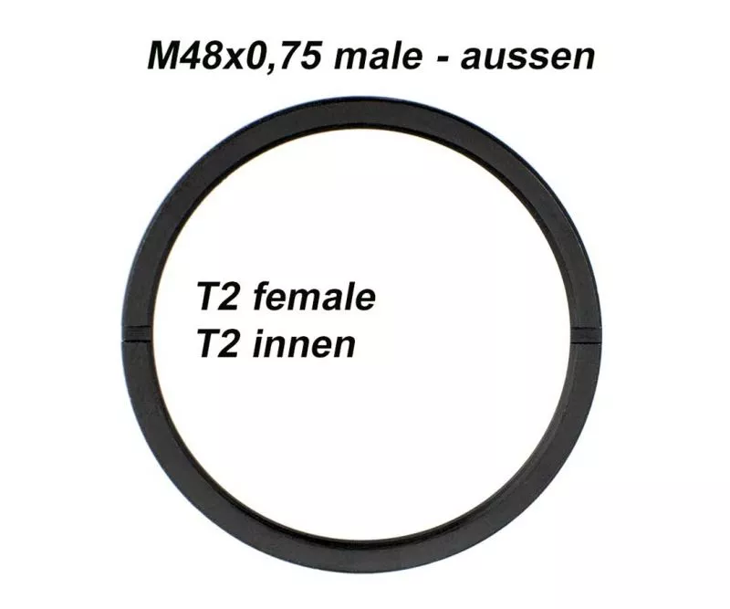 Der Adapter passt auf ein T2-Außengewinde und erweitert dieses auf M48x0,75 2" Filtergewinde. Damit können Sie Anschlussadapter mit M48x0,75-Innengewinde verwenden.