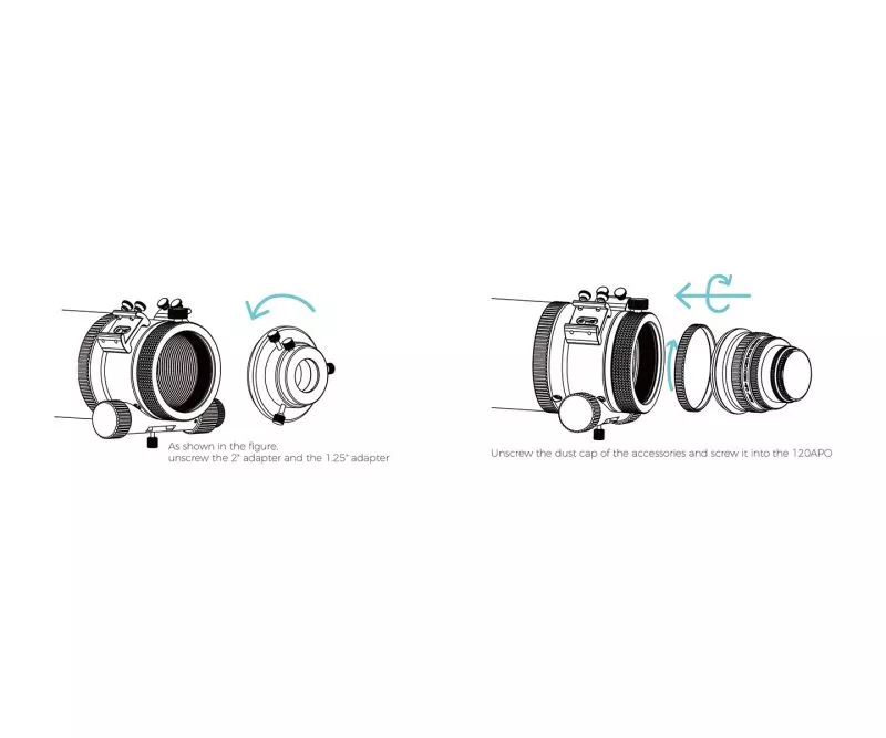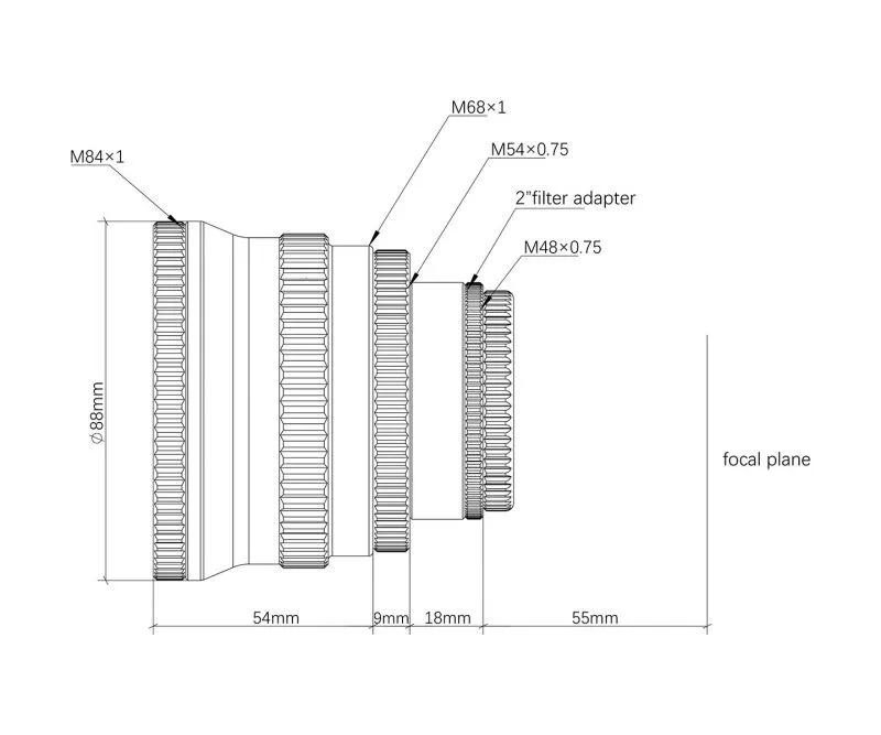 Auf der Kameraseite stehen zwei Außengewinde zur Verfügung: M54x0,75 und M48x0,75. Gleichzeitig kann das integrierte 2-Zoll-Filtergewinde (M48x0,75) für die direkte Montage von Filtern verwendet werden. Für eine sichere Lagerung liegen CNC-gefräste Metallschutzkappen bei.