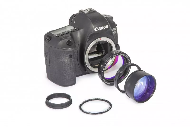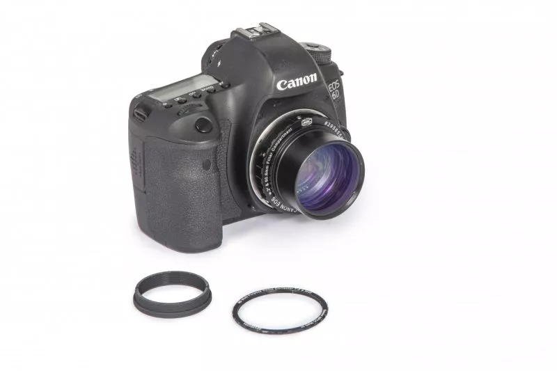 Canon DSLR mit Protective Canon DSLR T-Ring, M48 Distanzring und MPCC für maximalen Durchlass