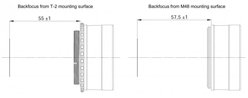 Das Basis-Element 2858400A ist für den Einsatz mit einer DSLR und einem Standard T-Ring vorbereitet, es kann über das T-2-Gewinde an allen Standard-T-Ringen verwendet werden. Da das T-Gewinde bei Kameras mit größerem Sensor (wie z.B. Vollformat-DSLRs) vignettiert, kann das T-2-Gewinde entfernt werden. Dann liegt ein M48-Gewinde frei, und der freie Durchlass steigt von 38 auf 44 mm. Über den M48 Distanzring für MPCC III / Protective EOS T-Ring kann der MPCC direkt an den Protective CANON DSLR-T-Ring T-2/M48 und 2" angeschlossen werden. Das Auflagemaß beträgt 55 mm mit dem T-2-Gewinde bzw. 58 mm für das M48-Gewinde.