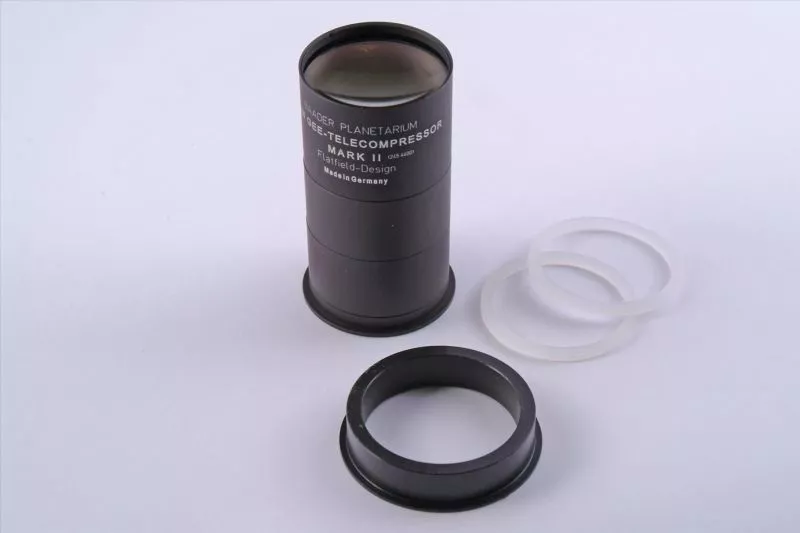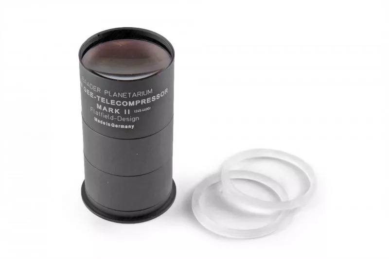 Wir haben Herrn Christen, den Hersteller der AstroPhysics Apochromaten, um ein Design für einen SC Telekompressor mit Flatfield-Korrektur gebeten, und er hat uns ein Linsensystem gerechnet, welches an vielen Teleskopen ein ebenes Bildfeld liefert. Der Alan Gee II Telekompressor ist für alle SC-Teleskope verwendbar und bietet besonders für die CCD-Technik große Vorteile durch seinen variablen Reduktionsfaktor von f 3,5 bis f 5,9. Besonders geeignet für die ""stand alone"" Guiding Kamera von SBIG.