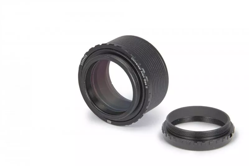 Der UAG II kann prinzipell auch mit einer Kamera (bis maximal APS-C) betrieben werden; der Abstand des UAG II zur Kamera sollte 121mm betragen. Da der Alan Gee II ursprünglich für die Montage im Blendrohr des Teleskops gerechnet war, empfehlen wir für den rein fotografischen Einsatz dennoch den klassischen Alan Gee Telekompressor Mark II (T-2 Bauteil #20) (#2454400, ¤ 245,-) in einer der beiden fotografischen Konfigurationen, die in seiner Bedieungsanleitung beschrieben sind.