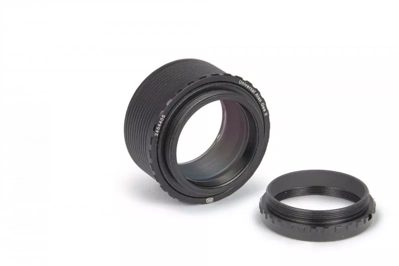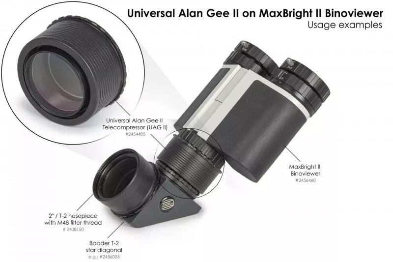 Der UAG II kann mit den mitgeliefertem T-2 Zwischenring 7,5mm (T-2 Bauteil #25C) (#1508155, ¤ 17,-) direkt an alle Baader T-2-Prismen und Spiegel angeschlossen werden. Auch wenn er in 2"-Prismen passen würde, empfehlen wir am Schmidt-Cassegrain weiterhin die kurzbauende Adaption mit einem T-2-Prisma und dem T-Adapter (BTA) für SC- und MAK-Teleskope (T-2 Bauteil #21) (#2408160, ¤ 56,-) , damit der ideale Fokuspunkt (und damit die Systembrennweite) möglichst wenig von der konstruktiven Brennpunktlage abweicht. Ein Binokular mit T-2-Anschluss wie das MaxBright® II oder das Mark V Großfeld-Binokular (#2456410, ¤ 1275,-) kann direkt an den UAG II angeschlossen werden. Der Abstand der Okulare vom Reducer beträgt dann ca. 120 mm.