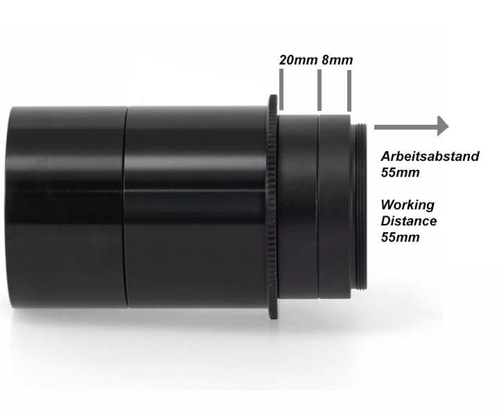 ♦ Arbeitsabstand 55 mm ab dem T2 (M42x0,75) Gewinde. Der Arbeitsabstand ist auf bis auf 73mm erweiterbar