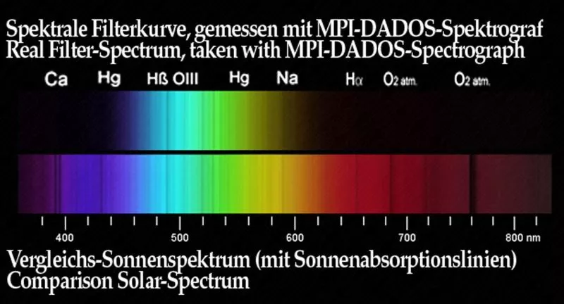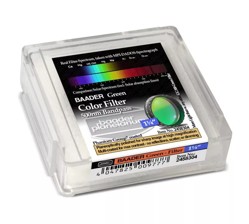 Baader-Rotfilter ≅ W25, Baader-Orangefilter ≅ W21, Baader-Gelbfilter ≅ W12, Baader-Grünfilter ≅ W58, Baader-Hellblaufilter ≅ W80A, Baader-Dunkelblaufilter ≅ W38A