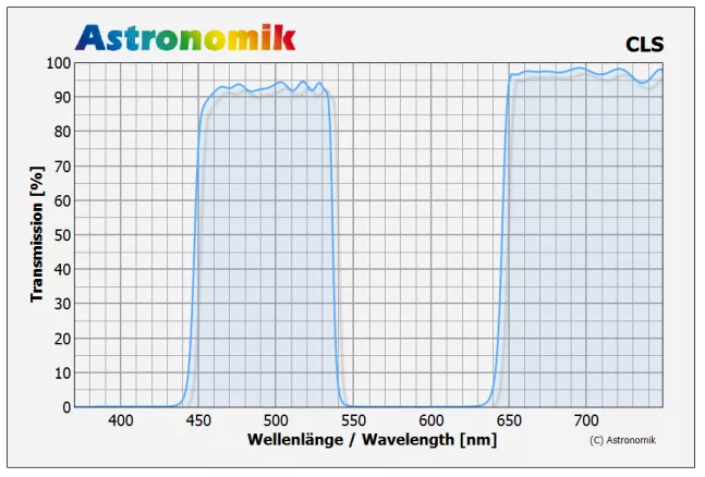 Der Astronomik CLS Filter ist für die visuelle Beobachtung von Nebeln, Galaxien und Sternhaufen mit Teleskopen konzipiert. Er blockt vollständig die Emissionslinien von Hoch- und Niederdruckdampflampen (Natrium (Na) und Quecksilber (Hg)) sowie alle Linien des natürlichen Airglow, während er den Großteil des sichtbaren Lichts und der Nebelemissionen durchlässt. Der Kontrast zwischen Deep-Sky-Objekten und dem Nachthimmel wird verstärkt, wodurch der Filter sich hervorragend für die Beobachtung in lichtverschmutzten Gebieten eignet. Der Astronomik CLS Filter lässt durch seinen großen Durchlassbereich viel Licht durch, sodass die Sterne nur minimal abgeschwächt werden. Der Filter ist so konstruiert, dass er so viel unerwünschtes Licht wie möglich blockt, aber dennoch möglichst viel Licht von astronomischen Objekten durchlässt.