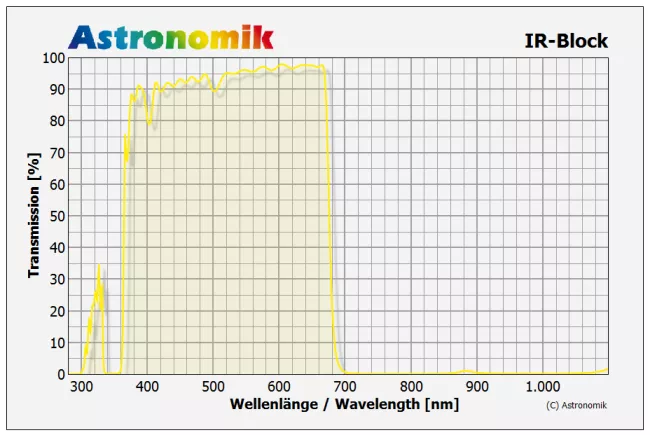 Die Blockung von IR-Licht verhindert Geisterbilder. Optische Systeme, die typischerweise für das sichtbare Spektrum korrigiert werden, können unterschiedliche Brennpunkte für sichtbares und IR-Licht haben, was zu einem unscharfen Geisterbild zusätzlich zu dem beabsichtigten Bild führt. Da viele Kameras für die Fotografie von Objekten des Sonnensystems empfindlich auf IR-Licht reagieren, ist die Blockung dieses Lichts von entscheidender Bedeutung, um diesen Geisterbildeffekt zu verhindern. Darüber hinaus dient der Astronomik IR-Block Filter als Schutz vor Staubpartikeln und Verunreinigungen für Teleskope und Kameras.