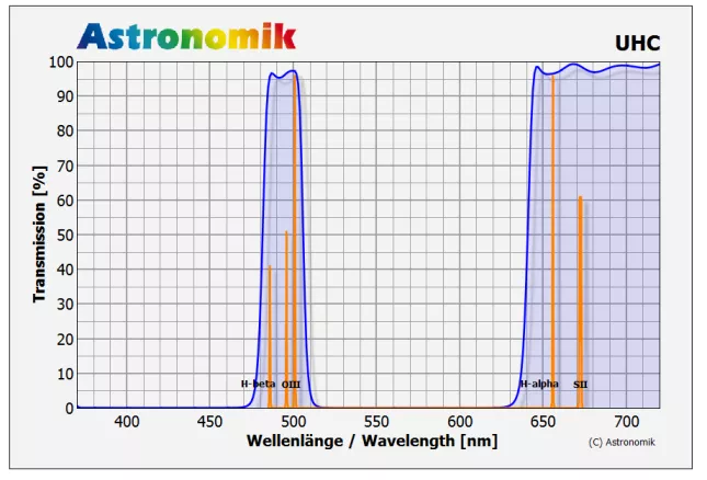 Der Astronomik UHC Filter ist die erste Wahl für die visuelle Beobachtung. Er bietet einen verbesserten Kontrast und zeigt mehr Details in Deep-Sky-Objekten im Vergleich zu anderen auf dem Markt erhältlichen Filtern. Mit seinem Ultra High Contrast (UHC)-Design ermöglicht der Filter eine außerordentlich hohe Transmission der OIII- und H-beta-Linien und blockt effektiv Streulicht aus verschiedenen Quellen, einschließlich Lichtverschmutzung. Dies führt zu einer deutlichen Verbesserung des Kontrasts von Gas- und Planetarischen Nebeln vor dem Himmelshintergrund.Der vielseitig nutzbare Astronomik UHC Filter ist sowohl bei städtischen als auch bei dunklen Himmelsbedingungen einsetzbar und verbessert den Kontrast von Emissionsnebeln und anderen Himmelsobjekten für mittlere und große Teleskope. Er erhöht die Sichtbarkeit und zeigt mehr Details an Objekten, die sonst schwach oder unsichtbar sind, erheblich.Der Filter kann für Öffnungsverhältnisse von 1:3 bis 1:15 eingesetzt werden und ist für eine Vielzahl von Teleskopen geeignet. Im Vergleich zu Filtern anderer Hersteller zeichnet sich der Astronomik UHC Filter dadurch aus, dass er mehr Sterne und feinere Details in Himmelsobjekten sichtbar macht und dabei die Schärfe und optische Qualität beibehält, die von hochwertigen Fernrohren erwartet wird.Der Filter blockt die Emissionslinien von Hoch- und Niederdruckdampflampen (Natrium (Na) und Quecksilber (Hg)) sowie alle Linien des natürlichen Airglow, während er die H-beta- und OIII-Linien durchlässt. Durch diese selektive Transmission wird der Kontrast zwischen dem Himmelshintergrund und den beobachteten Objekten verstärkt.Darüber hinaus wird der Astronomik UHC Filter für Beobachtungen von Jupiterwolken empfohlen und bietet eine verbesserte Trennung von Doppelsternen. Zusammenfassend bedeutet dies, dass der Astronomik UHC Filter die Details und den Kontrast bei der Deep-Sky-Beobachtung maximiert. Er ist ein unverzichtbares Werkzeug für alle Deep-Sky-Beobachter.Andere Anwendungen
