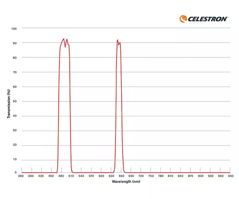 Celestron testet jeden Nebelfilter für Origin einzeln, um seine Leistung zu überprüfen. Zusammen mit Ihrem Filter erhalten Sie ein spektrales Transmissionsdiagramm (wie das oben abgebildete), das die Ergebnisse des Tests Ihres Filters zeigt und bestätigt, dass er im gesamten Spektrum die erwartete Leistung erbringt.