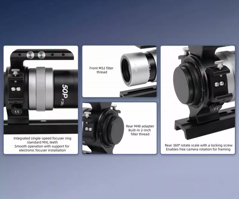 Öffnung: 50 mm, Brennweite: 190 mm, Öffnungsverhältnis: 1:3,8Optisches Design: Quadruplet-Petzval-Apochromat (einschließlich einer SD-Linse)Unterstützt das APS-C-FormatHelikalauszug mit 360°-RotationM48-Anschluss (mit M48×0,75-Filtergewinde)Für Astrokameras, DSLR und spiegellose Systemkameras geeignet mit geeignetem AdapterGesamtlänge nur 147 mm (Taukappe eingefahren)Gesamtgewicht (einschließlich Rohrschelle und Prismenschiene) nur 1,4 kg